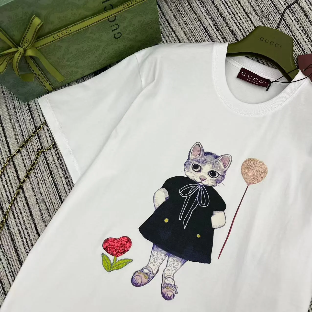 Gucci 2026SS Beaded Cat Print Crewneck T-Shirt