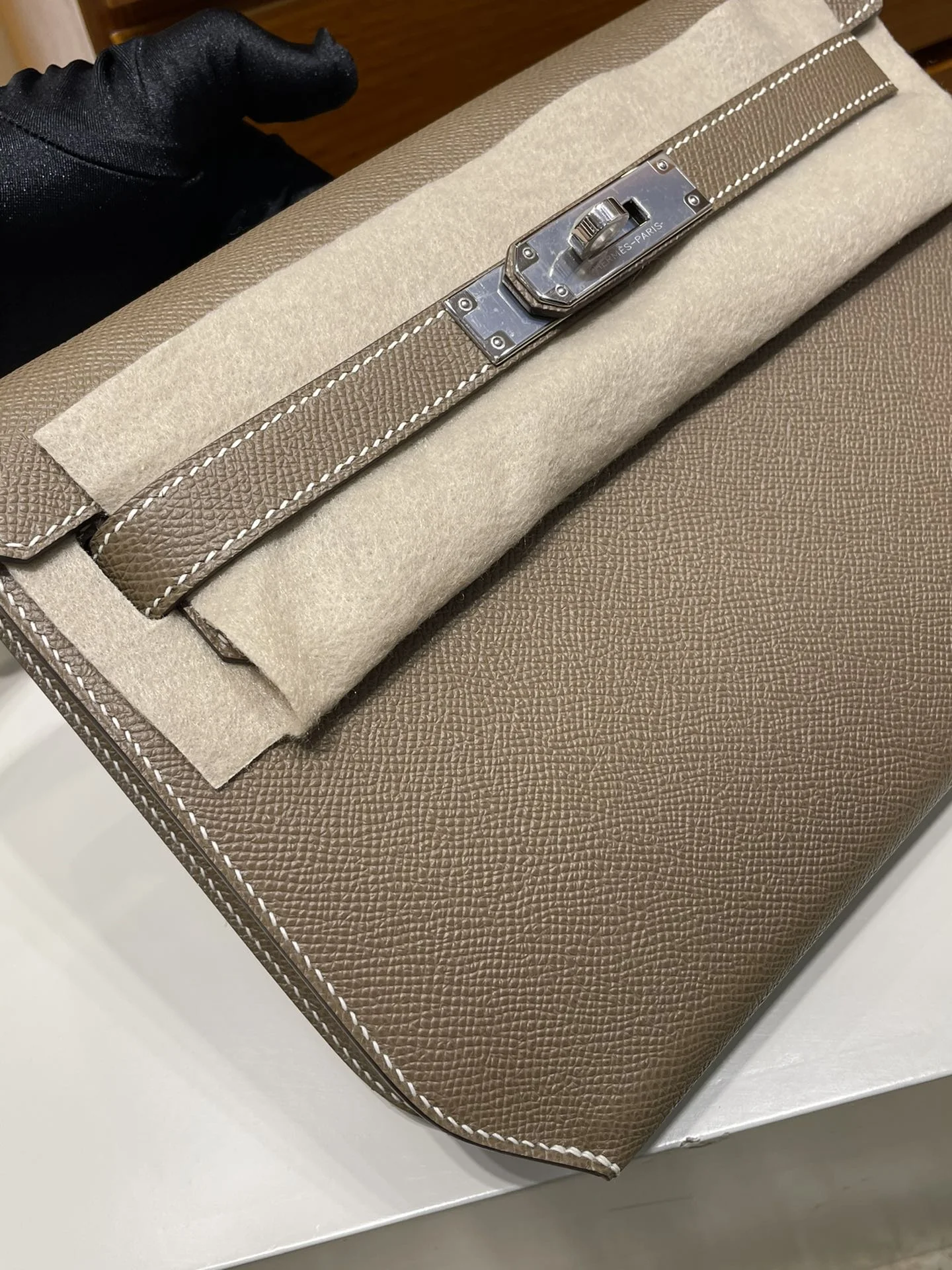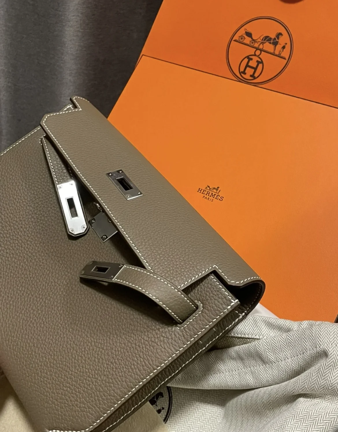 HERMES Kelly depeches 25cm Epsom Etoupe Silver Hardware