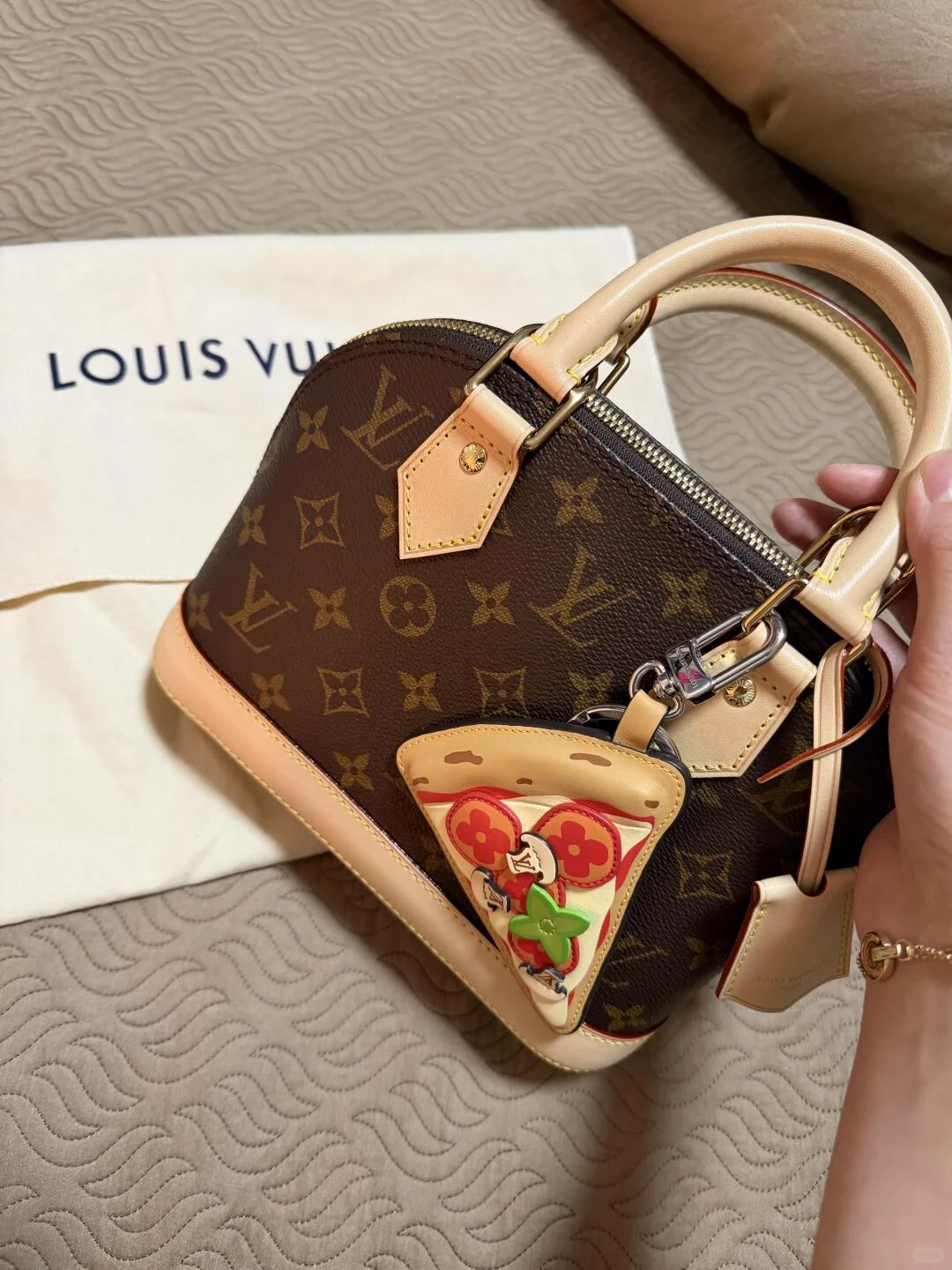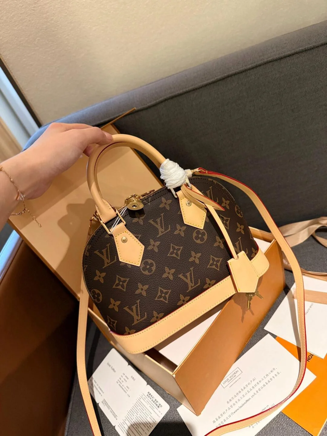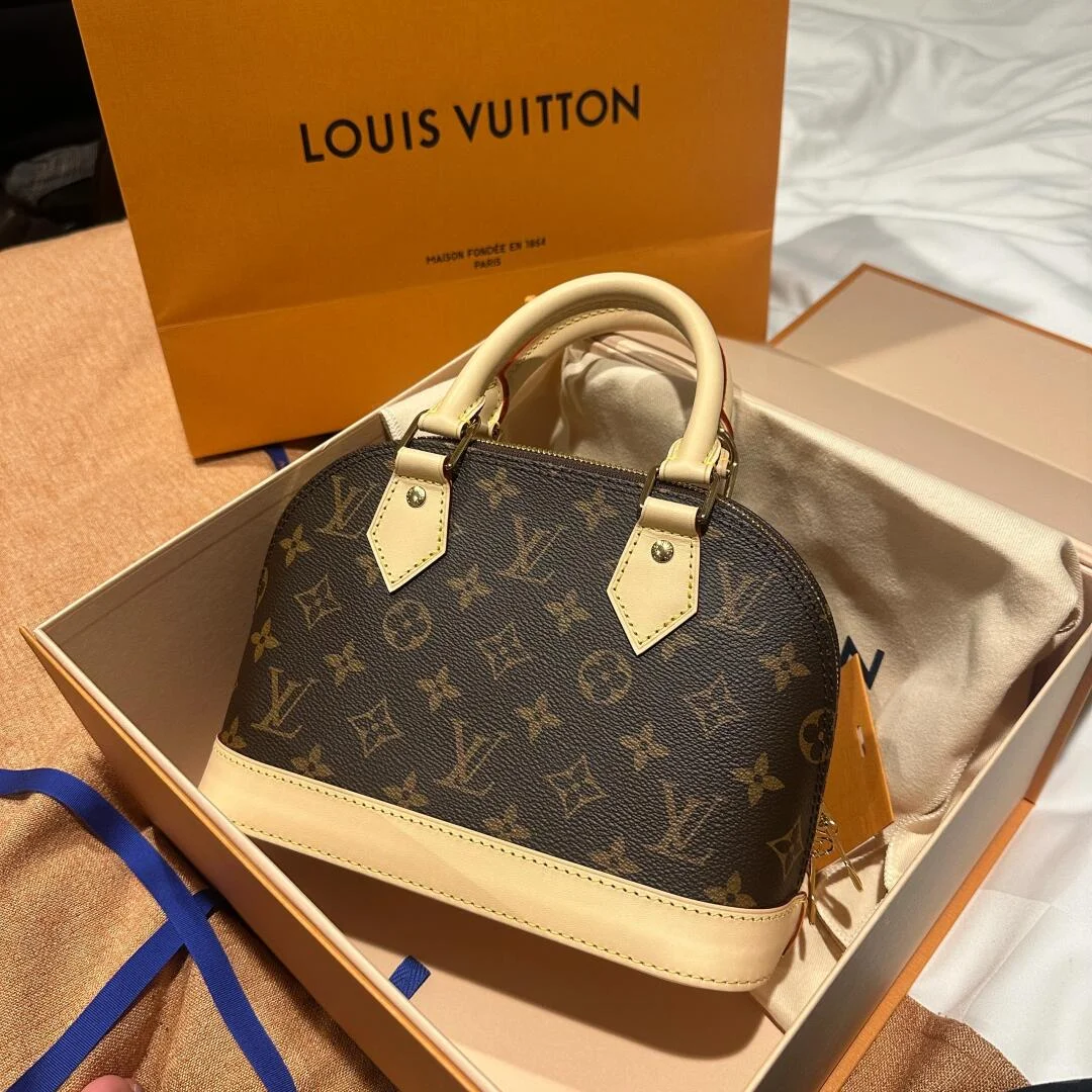 This Alma BB handbag draws inspiration from the Art Deco style of 1934, crafted in Monogram canvas to create an elegant silhouette. Shining padlock and key, Toron handles, and a leather key pouch highlight classic details, while the detachable and adjustable shoulder strap allows for convenient crossbody wear.