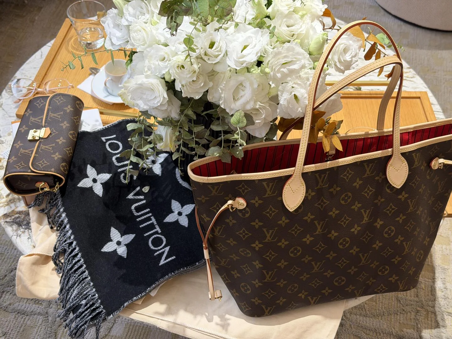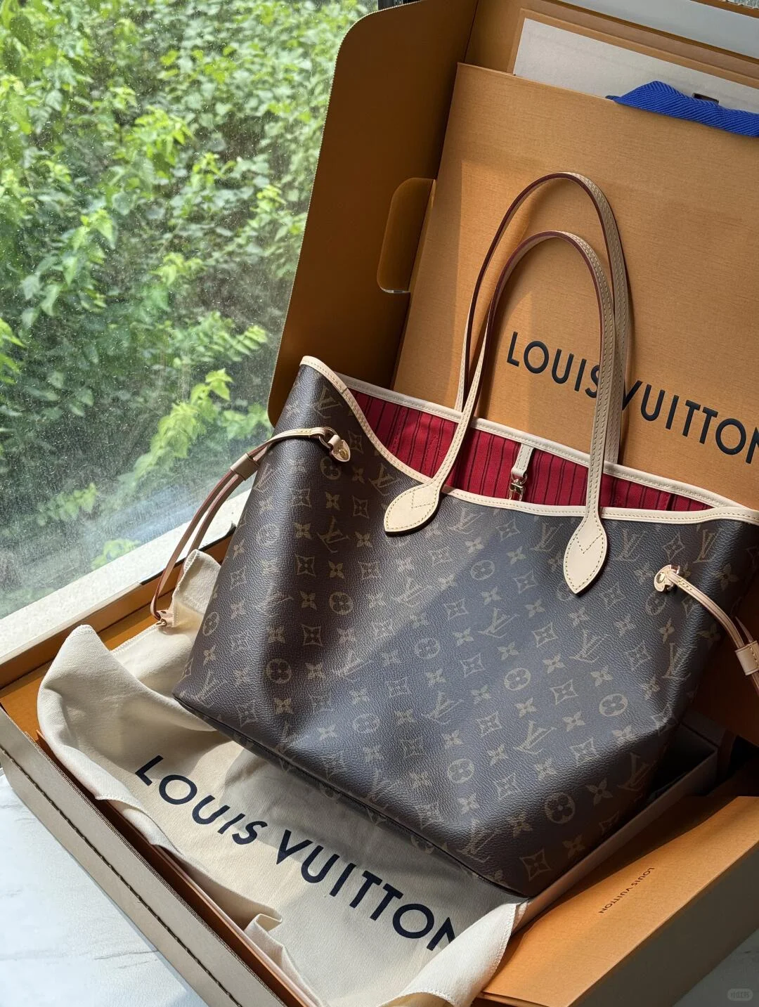 This Neverfull Medium tote bag features soft Monogram canvas with cowhide leather trim, combining a spacious silhouette with vibrant fabric lining. The side straps offer versatile styling, whether cinched or loosened. Thin handles allow for shoulder or elbow carry, while the removable zip pouch can be used as a clutch or pocket.